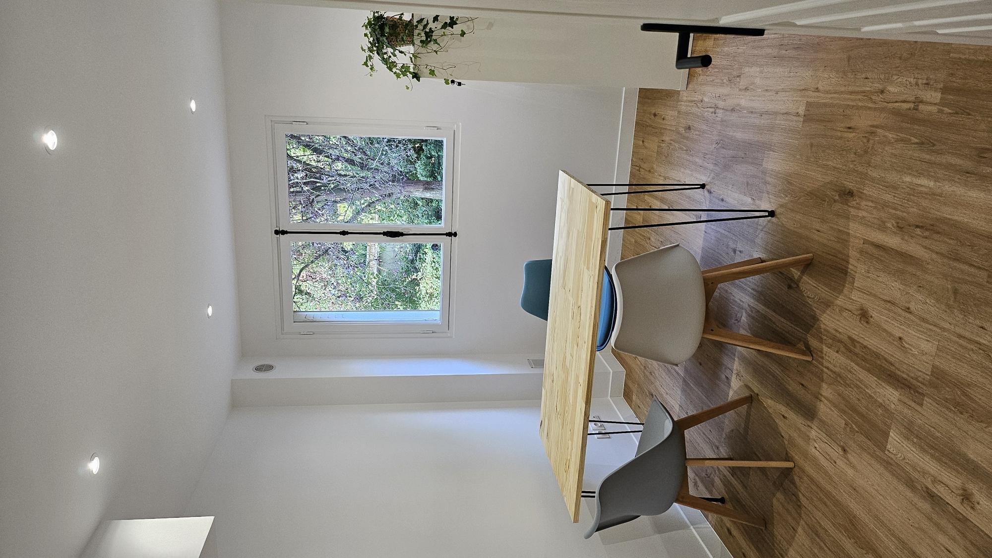 Le bureau a été refait à neuf, est calme et clair / avec une vue dégagée sur jardin.