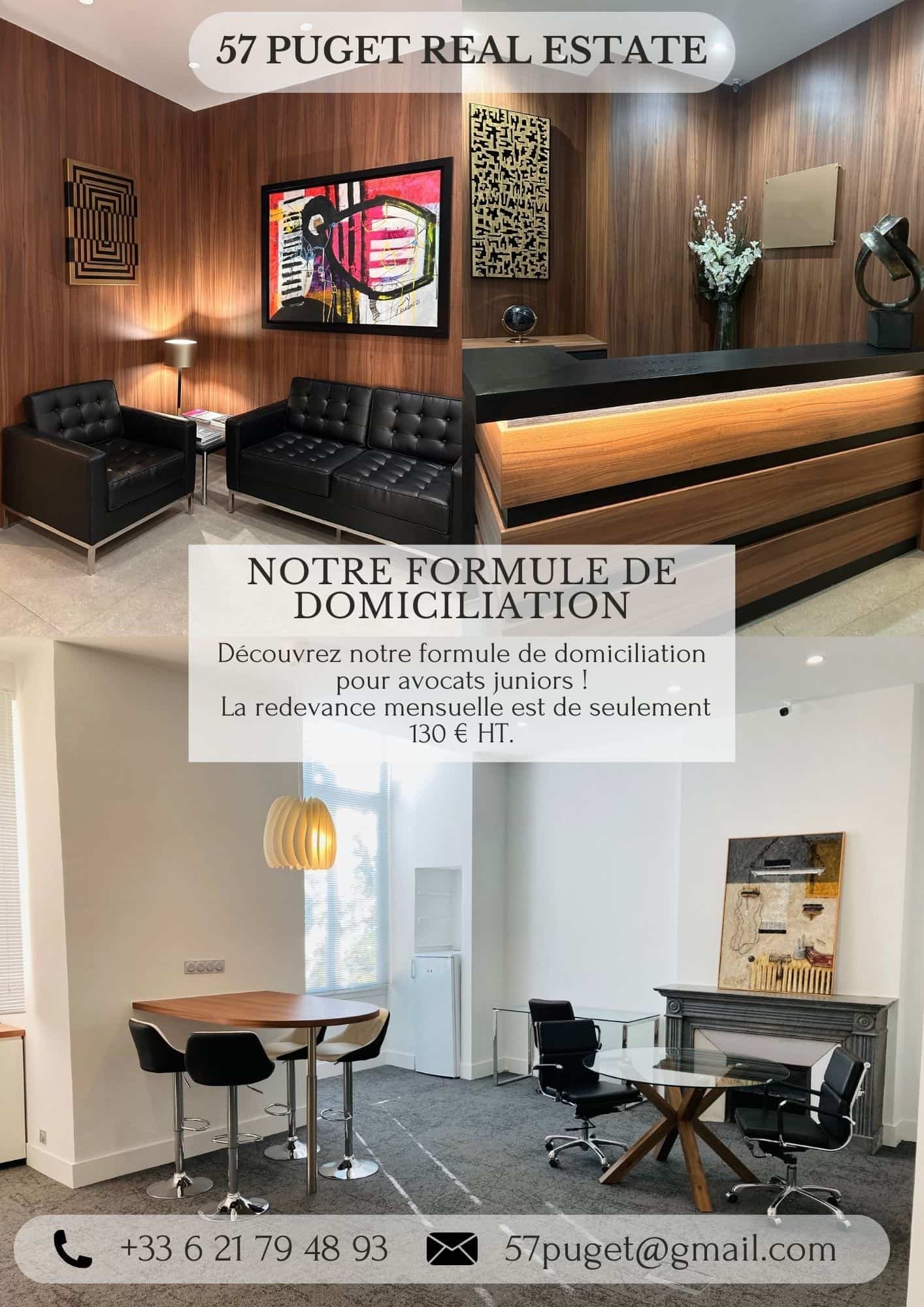 Notre formule de domiciliationOffre - Bouches-du-Rhône (13) Découvrez notre formule de domiciliation pour avocats juniors !La redevance mensuelle est de seulement 130 € HT.Gaia 57 PUGET REAL ESTATE57puget@gmail.com0621794893