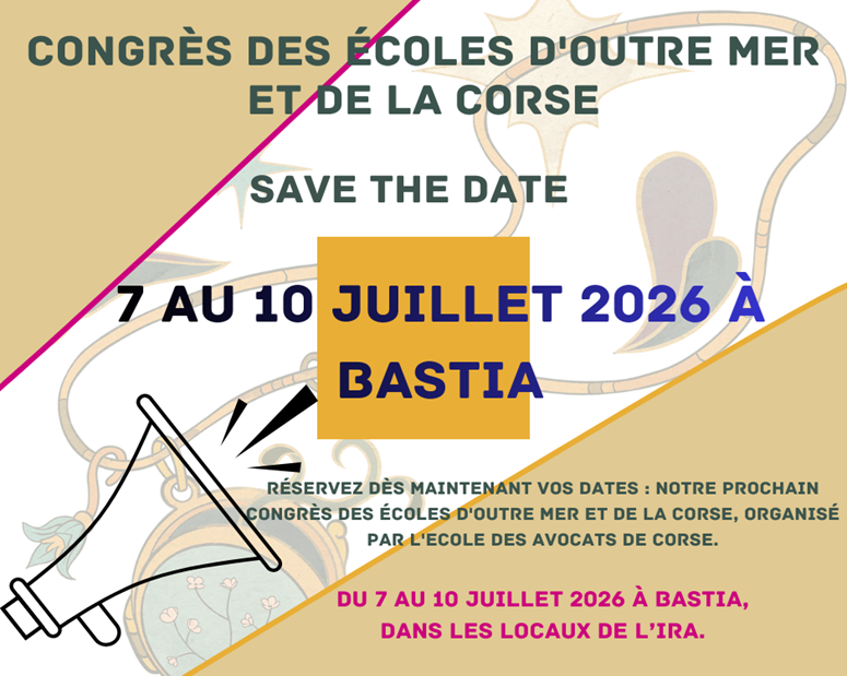 Après le 4ème Congrès des écoles d'Outre-Mer organisé par l’EDA de Guyane et les fabuleuses « Rencontres en Corse » organisées par l’EDA de Corse en juillet 2025, nous sommes ravis de vous annoncer que : « le 5ème Congrès des écoles d'Outre-Mer et de Corse se tiendra du 7 au 10 juillet 2026, dans les locaux de l’IRA à BASTIA ».