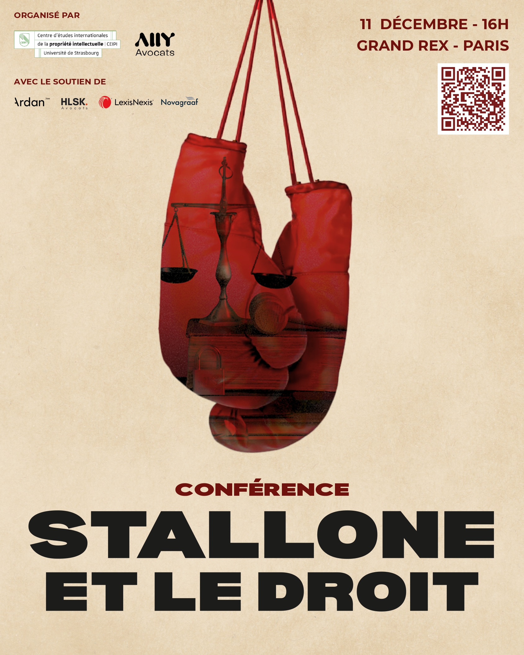 Le jeudi 11 décembre, le Centre d'Etudes Internationales de la Propriété Intellectuelle - CEIPI et ALLY Avocats investissent le Grand Rex pour une conférence unique. Après Friends & le droit et James Bond & le droit, cette nouvelle édition vous invite à explorer l'univers de Sylvester Stallone.