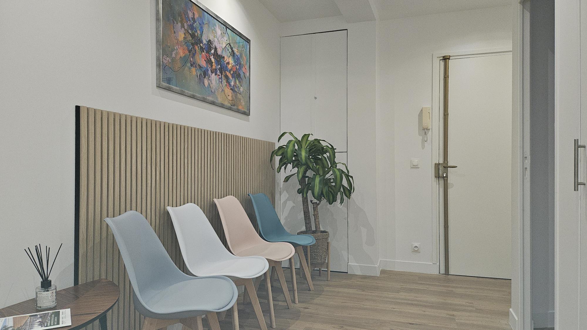 La salle d’attente (13-14 m²) et la cuisine (réfrigérateur, four micro-onde, machine à café, bouilloire) sont à usage commun.