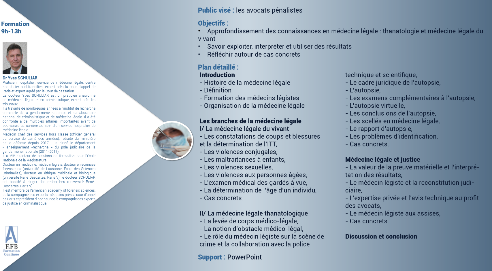 Lors de cette formation, il s’agira d’exposer l’importance de la médecine légale tout au long du processus judiciaire depuis les premières constatations jusqu’au rapport d’expertise et au témoignage de l’expert au procès. La séance permettra de donner des clés de compréhension pour obtenir une meilleure exploitation, interprétation et utilisation des résultats que les avocats pourront utiliser dans leur pratique quotidienne. De nombreux cas concrets illustreront l’exposé et serviront de base à la discussion.